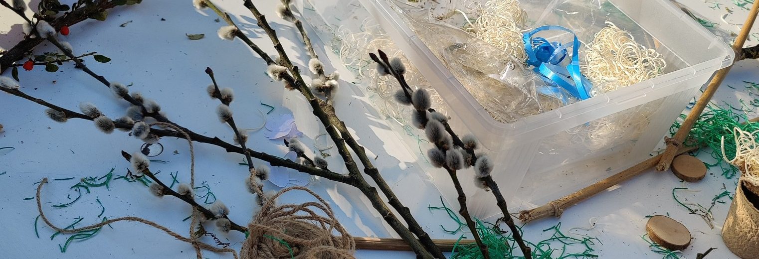 Eier, Schleifen und allerlei Schmuck für das Osterfest lagen nun verstreut auf Wiesen- und Feldwegen – genau dort, wo es besonders holperte. Die Aufgabe der Kinder war klar: Alles wiederfinden, damit der Osterhase später auch weiß, wo er seine Ostereier verstecken soll. Zusätzlich sollte jedes Kind einen passenden Zweig finden, um daraus später ein eigenes Oster-Mobile zu basteln.